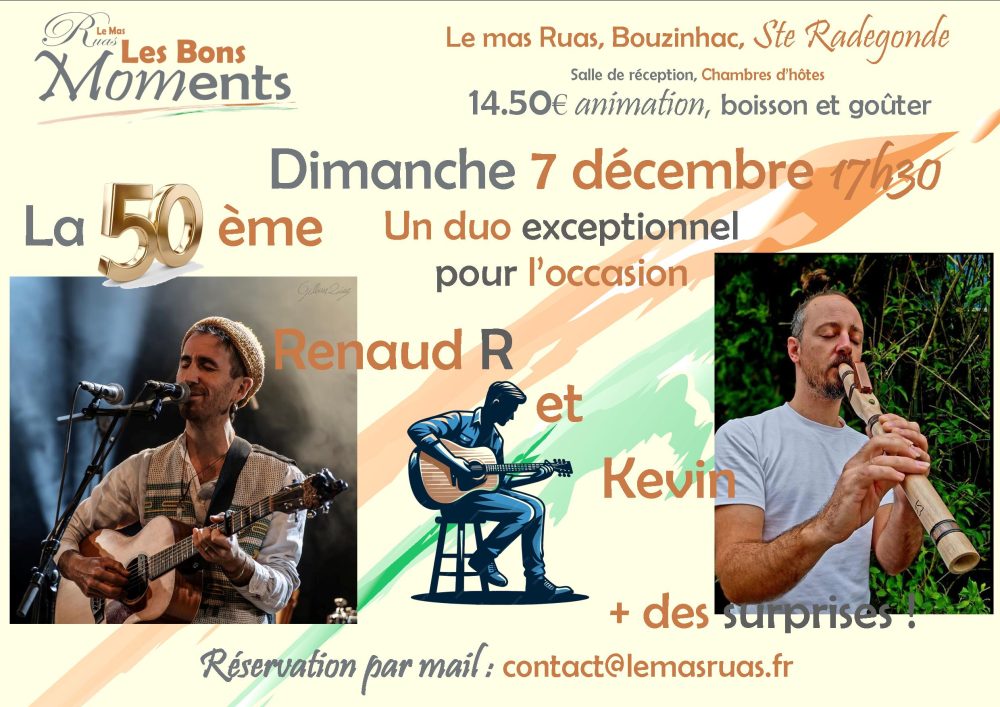 il est des moments où l’on ne peut choisir. les différents univers de Renaud R et Kevin B se sont réunis en cette 50ème des bons Moments du mas Ruas. c’était un challenge que de proposer à ces 2 musiciens un concert en commun pour cet évènement. ils réussirent le pari haut la main, les spectateurs ne s’y sont pas trompés, la grand qualité était au rendez vous de cette 50ème